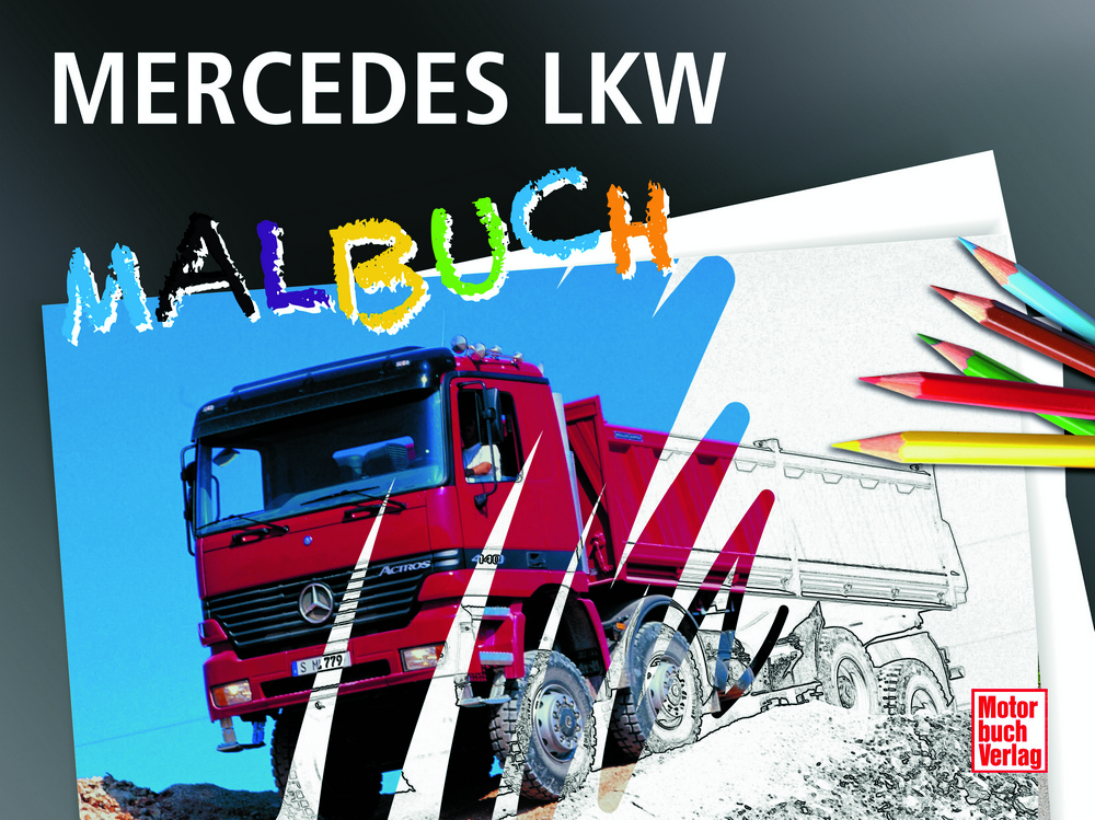 Die Giganten von Mercedes-Benz in einem einzigartigen Malbuch. Jede Doppelseite verbindet Wissen und Kreativität: Links das Originalfoto eines LKW mit Infotext und technischen Daten, rechts die passende Zeichnung zum Ausmalen. Kreativität und Wissen für junge Autofans!